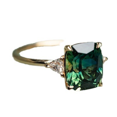 Four-claw Setting: Secure and elegant design showcasing the square green gemstone prominently.